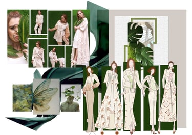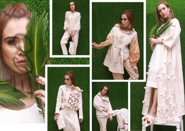 This thesis collection focuses on sustainable innovation and material experimentation. It highlights the creation of a new fabric made from waste cotton yarn fibers, transforming textile waste into a refined design element. Eco-friendly and low-impact dyeing techniques have been employed to achieve organic tones and textures, celebrating natural variations rather than striving for perfection. Inspired by botanical forms and handcrafted processes, the collection combines surface design, embroidery, and fabric manipulation to present a conscious fashion narrative where sustainability and aesthetics are seamlessly intertwined.