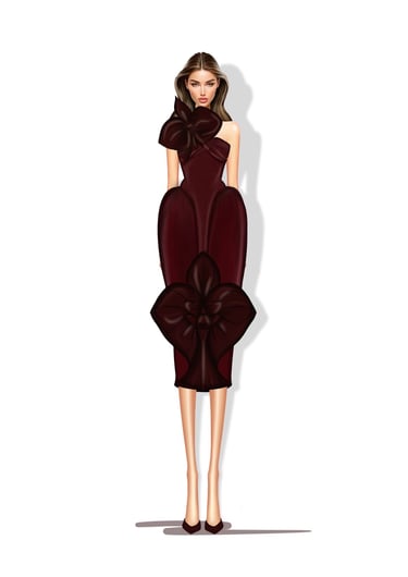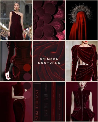 Crimson Nocturne delves into deep crimson hues and sculptural silhouettes, conveying a sense of quiet drama and refined strength through modern couture.