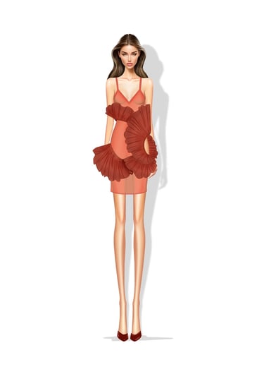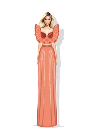 Inspired by organic folds, sheer layers, and warm coral tones, it conveys that softness can be a form of strength.