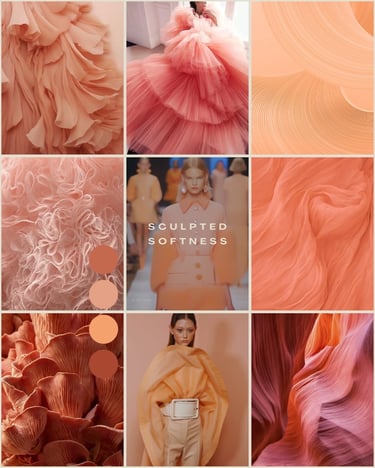 Sculpted Softness explores the delicate balance between structured silhouettes and fluid forms, conveying modern femininity through refined volume and gentle movement.